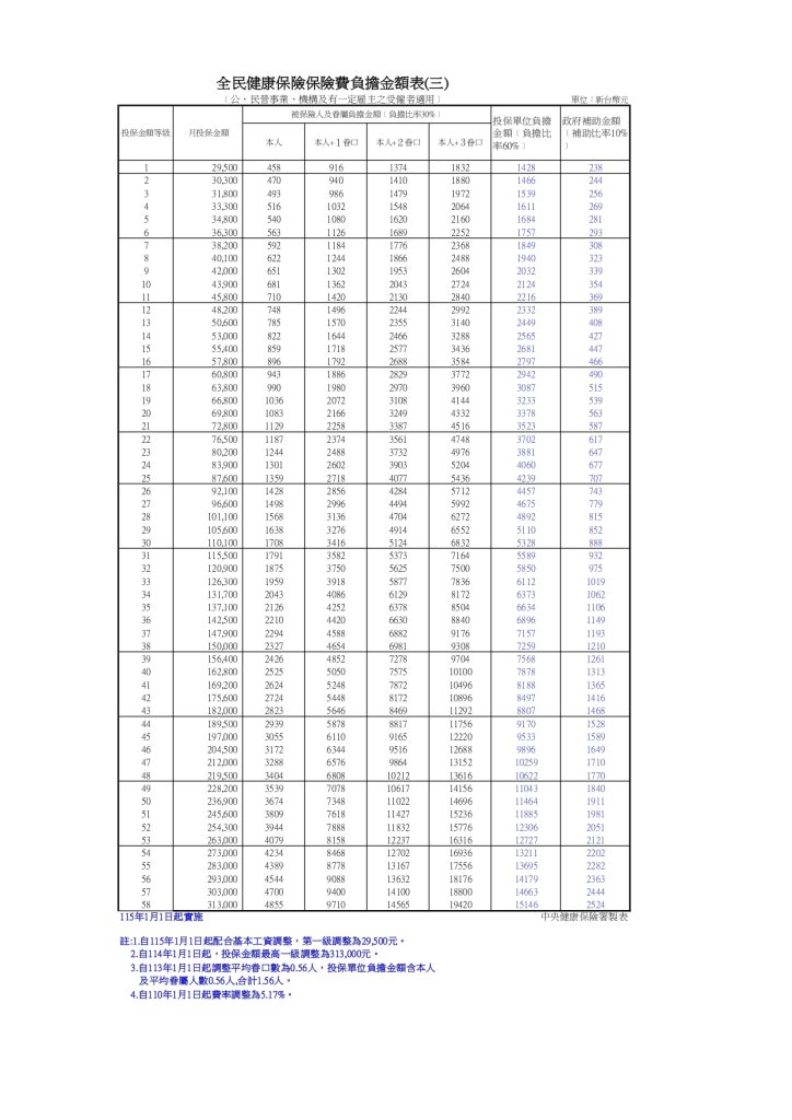 (另外若要眷屬依附在負責人身上,因為負責人沒有單位跟政府負擔部分比率,且級距費用會跟負責人一樣,跟上圖相比就看得出貴了不少)